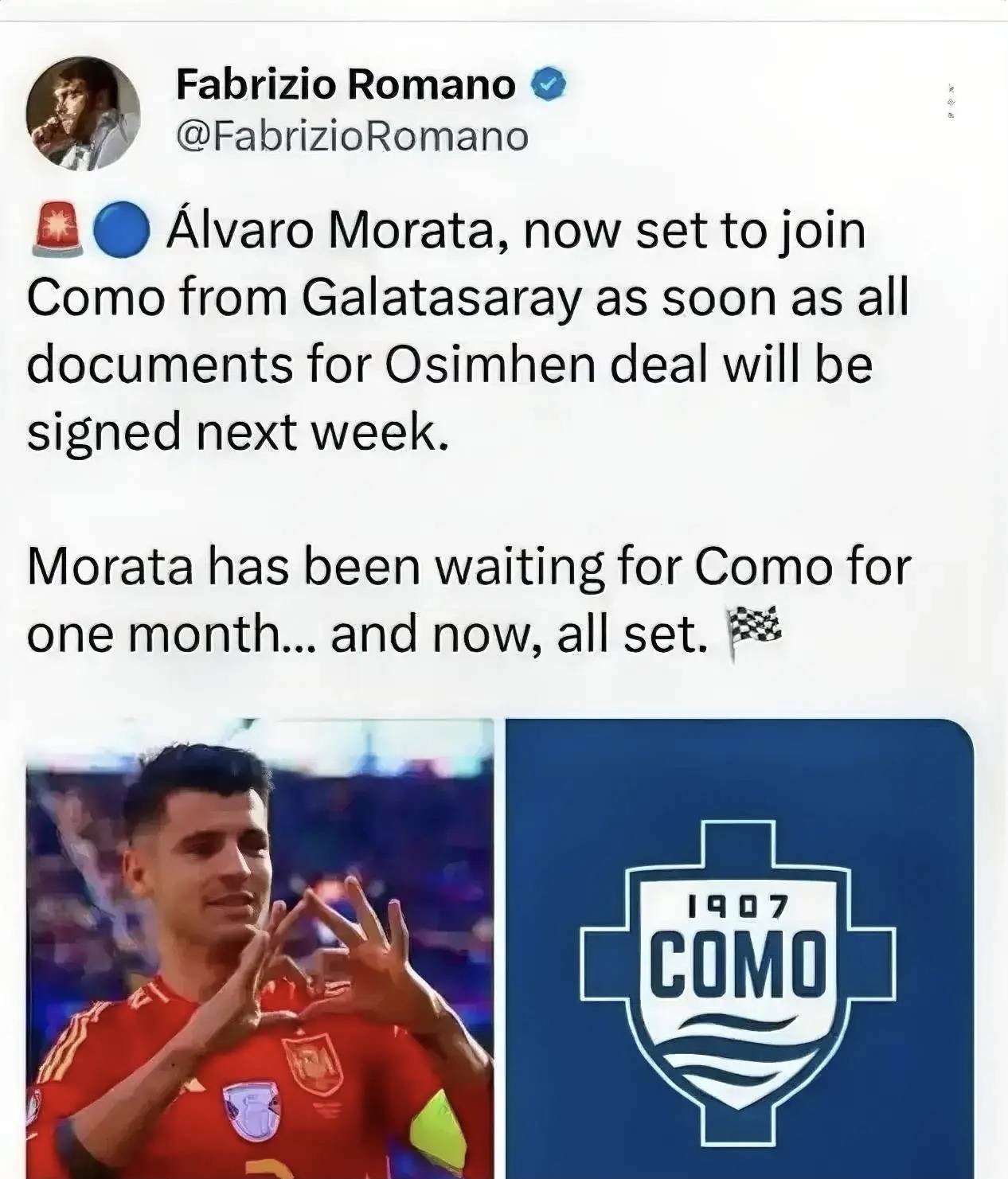 同样是罗马诺的消息,罗马诺早些时候报道说奥斯梅恩加盟土耳其加拉塔萨雷俱乐部,转会费7500万欧元,奥斯梅恩加盟土耳其加拉塔萨雷俱乐部后,加拉塔萨雷俱乐部愿意放莫拉塔离开,莫拉塔加盟科莫俱乐部会为米兰带来大概1500万欧元左右的收入,这笔意外的收入会为米兰转会市场带来帮助。